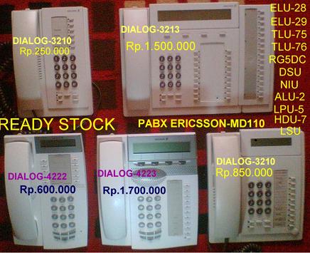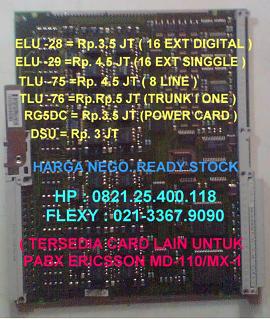 Selain pabx panasonic , tersedia pabx ericsson md-110 / mx- one beserta card ext ,card line dan card atau modul ericsson yang lainya.Modul pabx ericsson md110 atau card pabx ericsson md110 yang tersedia pada kami antara lain modul ericsson md110 type ELU-29,ELU-28,TLU-75,TLU-76,ELU-5,ELU-11,TLU-44,TLU-20,RG5DC,PU4DC,DSU,TSU,LFU,